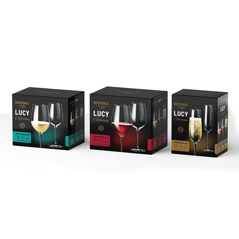 Zestaw 6 eleganckich kieliszków do wina Bohemia Prestige Lucy o pojemności 600 ml każdy. Wykonane z wysokiej jakości szkła kryształowego, łączą klasyczną formę z delikatnie wydłużonym pęcherzem, co podkreśla aromat i smak serwowanych win. Smukła nóżka zapewnia wygodny chwyt, a stabilna podstawa zwiększa komfort użytkowania.
